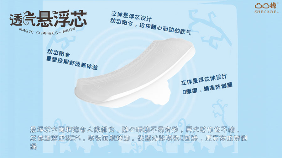 凸凸棉悬浮芯卫生巾为女生在经期活动提供了很大的便利。在经期,女生非常怕走动,这不光是由于经期本身的不适,还有一部分原因便是卫生巾使用过程中走动十分容易擦伤女生娇嫩肌肤,有了悬浮芯,女生们时刻都能解开束缚,放飞自我!