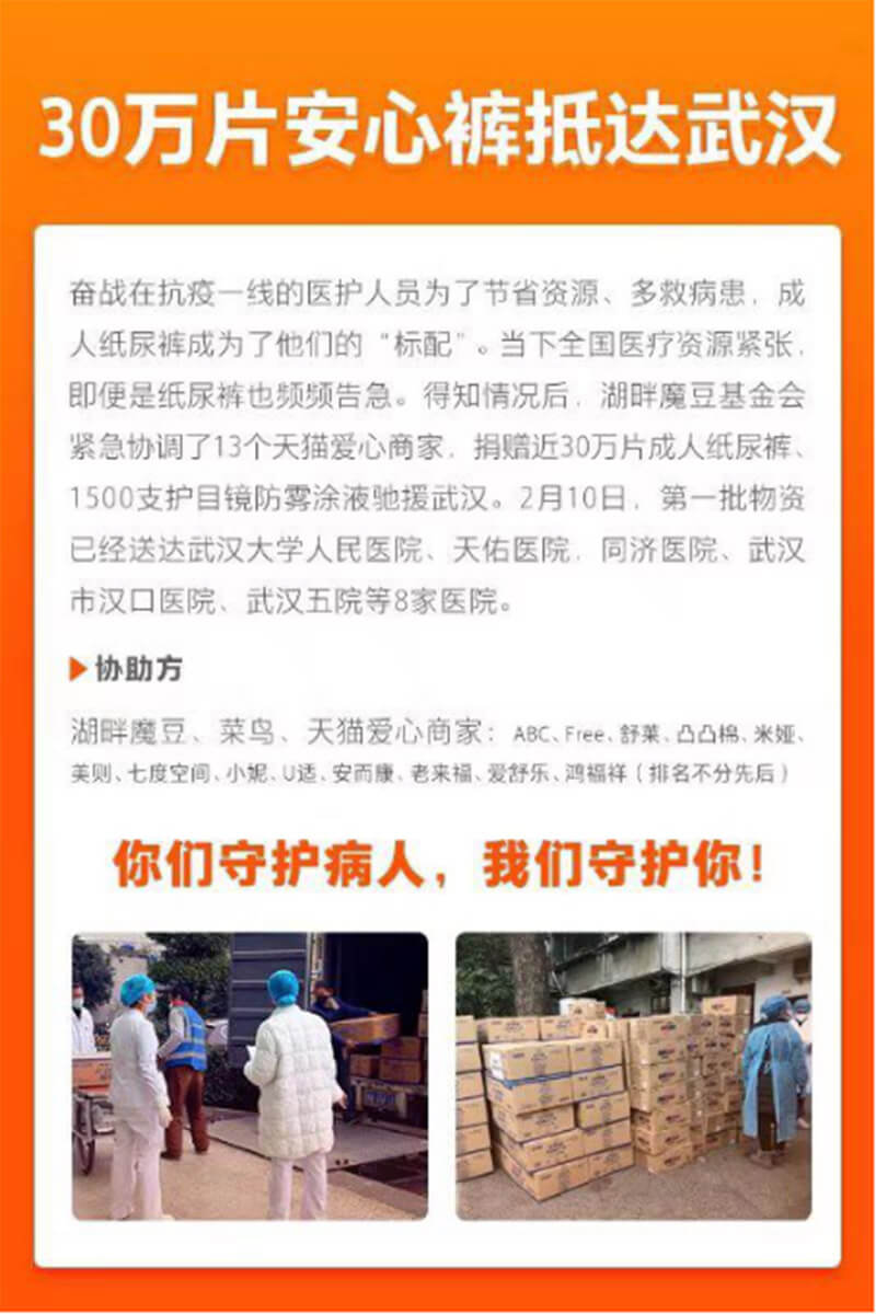 面对武汉纸尿裤物资匮乏,天猫商家与湖畔魔豆向社会紧急筹集三十万纸尿裤。舒莱收到消息后便立刻发起了第二次捐赠,尽自己的力量向武汉捐赠了价值五十万元的安心裤,共计十万件,占据捐赠总数的三分之一,以解决目前所遇到的紧急问题。只有让医务人员的生活得到保障,医务人员才能以更好的状态投入到这场抗疫战争中。