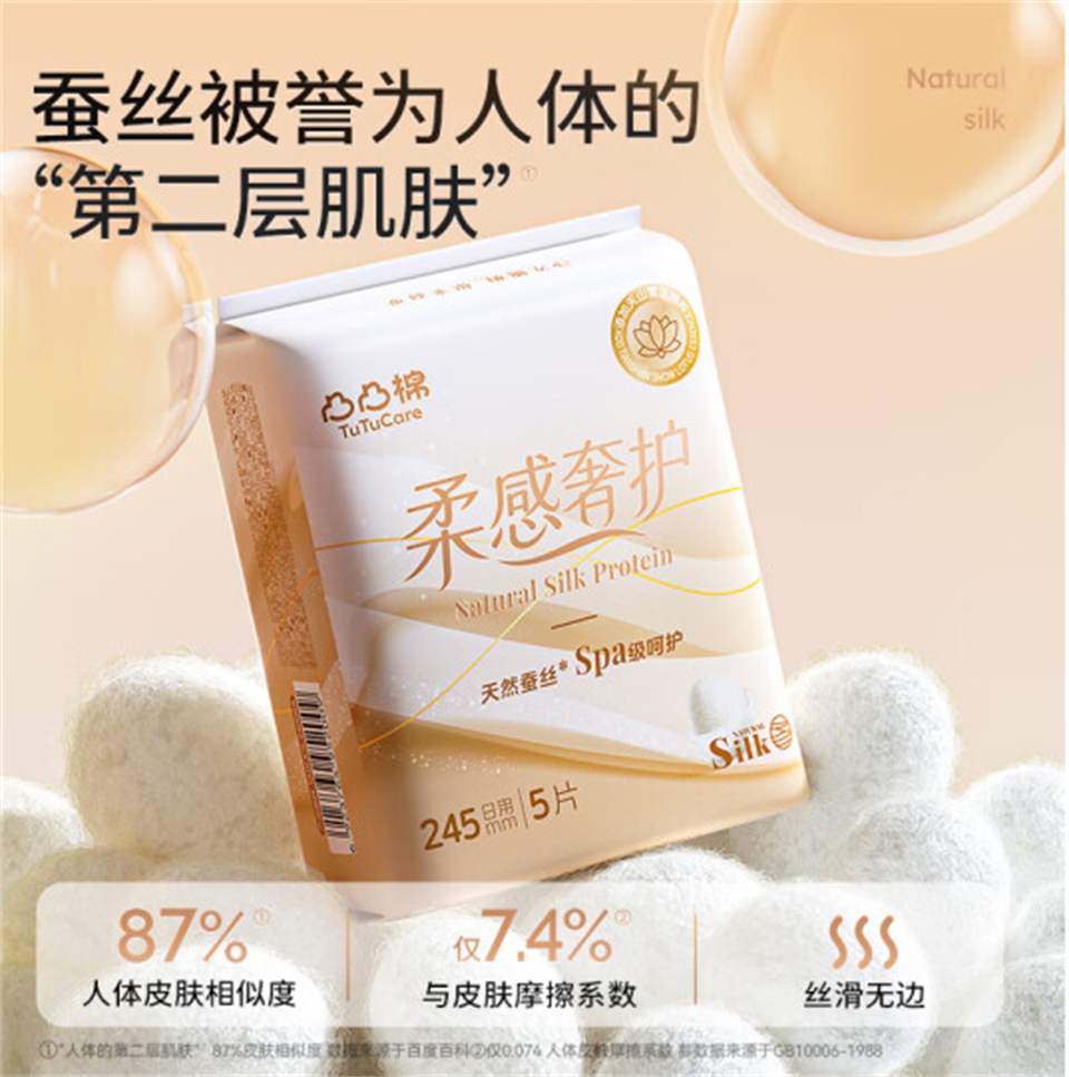蚕丝卫生巾是凸凸棉柔感奢护系列的又一产品,以“肤感”为主导,为女性打造不一样的经期使用体验。蚕丝卫生巾采用天然蚕丝制作,这是一种被誉为“人体的第二层肌肤”的材料,高达87%的皮肤相似度,与肤感无比接近,柔滑如锻,细腻丝滑,打造奢柔亲肤感。1.0D的超柔纤维护翼,超声波面层工艺,让卫生巾通体柔软,触摸更舒心。此外,蚕丝与皮肤之间的摩擦系数只有7.4%,以其为原料的卫生巾能够真正做到丝滑无边,减少摩擦,敏感肌肤也能随心用。